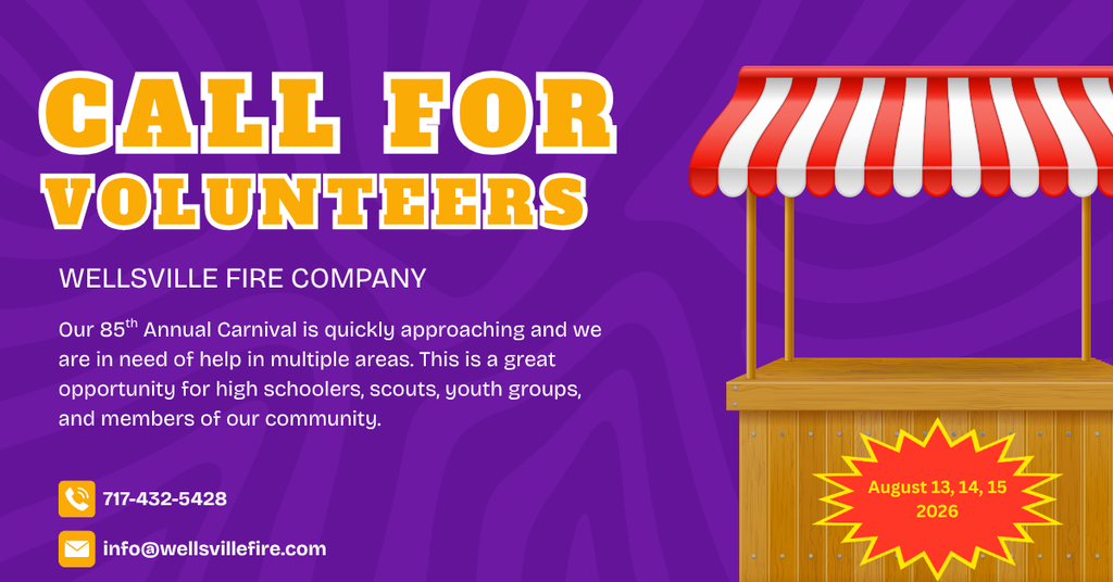 We are also recruiting volunteers for many areas of the carnival, one night, two nights, or all three nights, any help would be greatly appreciated. Send an email with your contact information to info@wellsvillefire.com.